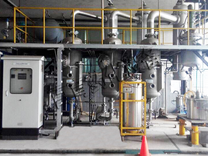 三效蒸發(fā)器是將一個蒸發(fā)器產(chǎn)生的二次蒸汽再次當(dāng)作加熱源,引入另一個蒸發(fā)器,只要控制蒸發(fā)器內(nèi)的壓力和溶液沸點(diǎn),使其適當(dāng)減少,則可利用蒸發(fā)器產(chǎn)生的二次蒸汽進(jìn)行加熱。結(jié)晶機(jī)此時,蒸發(fā)器的冷凝處就是蒸發(fā)器的加熱處。